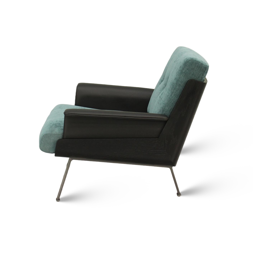 W840*D860*H790*400 "Legs: Black random-grain stainless steel; Armrests: Hard upholstered leather; Seat board + Backrest: Curved wood board with mountain-grain oak veneer, finished with black paint; Upholstered seat cushions + Backrest cushions"